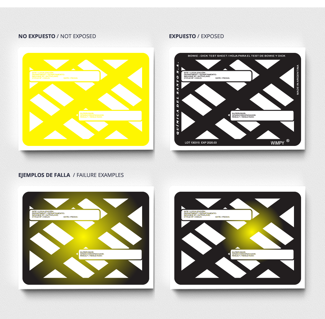 El test de Bowie y Dick debe realizarse todos los días en las autoclaves de prevacío para verificar la eficacia de penetración del vapor. Para esto se coloca en el centro de un paquete normailzado una hoja indicadora sensible a la presencia de vapor pero no al calor seco. La hoja de Bowie y Dick WIMPY cumple con estos requisitos.